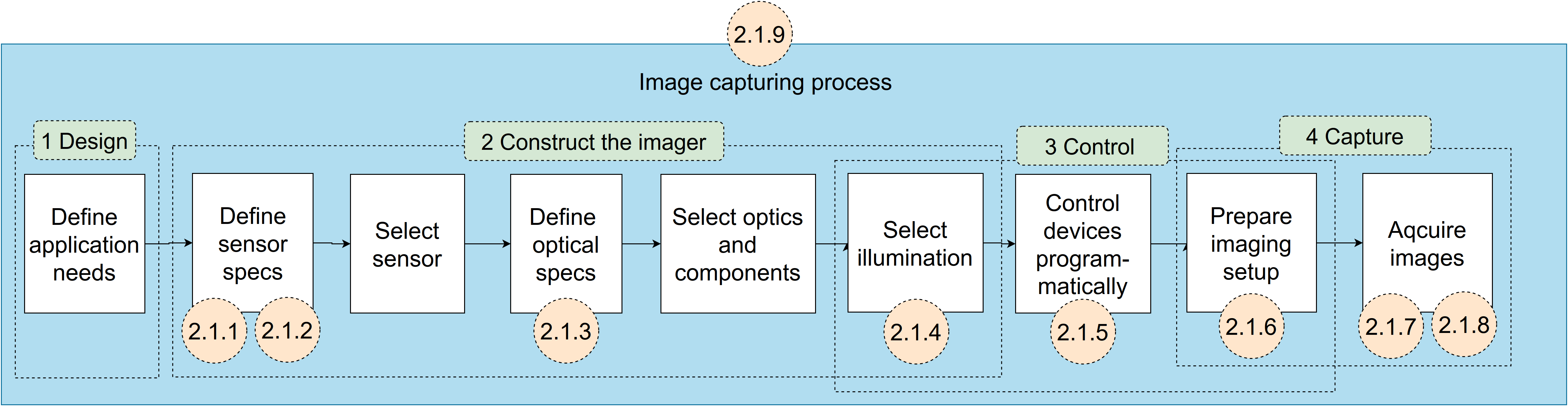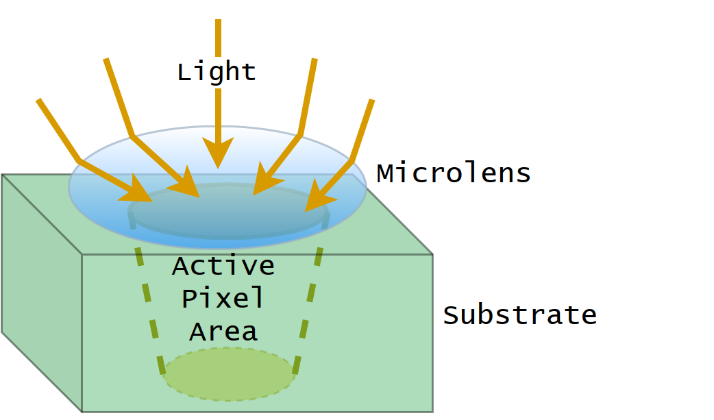 Dynamic range (DR, Figure 1) is the ratio between the smallest and largest amplitude of the signal a sensor can produce (Baumer 2022). It describes the imager’s ability to simultaneously provide detailed information from bright and dark areas. The parameter is important when the illumination conditions rapidly change or the targets have a strong contrast. The area that can capture light is called the fill factor. Since each pixel in a CMOS sensor has its own readout, charge conversion and digitalisation structures (visualised as the substrate, below in Figure 9), the interline transfer might have a 20-50% fill factor from the pixel size (Stemmer 2022). This affects the sensors’ overall photosensitivity, which can be improved, for instance, by using microlenses in front of the pixels (Figure 2).