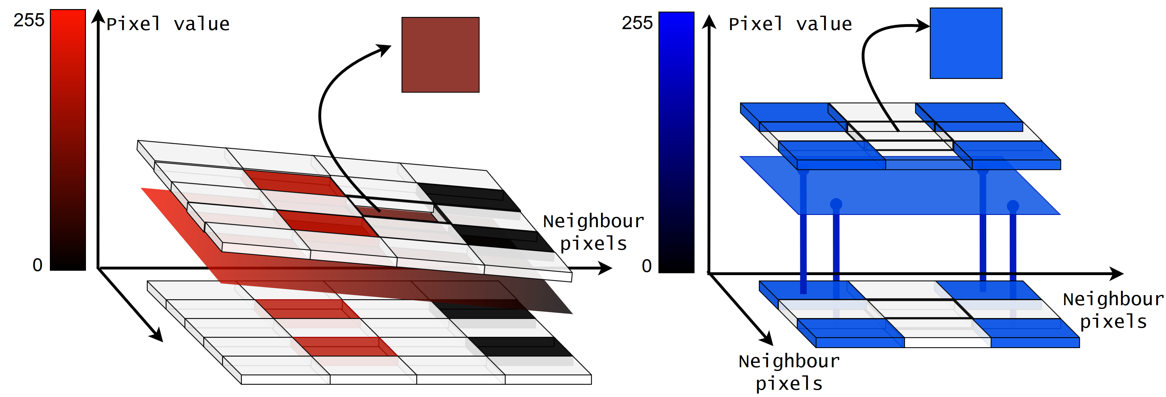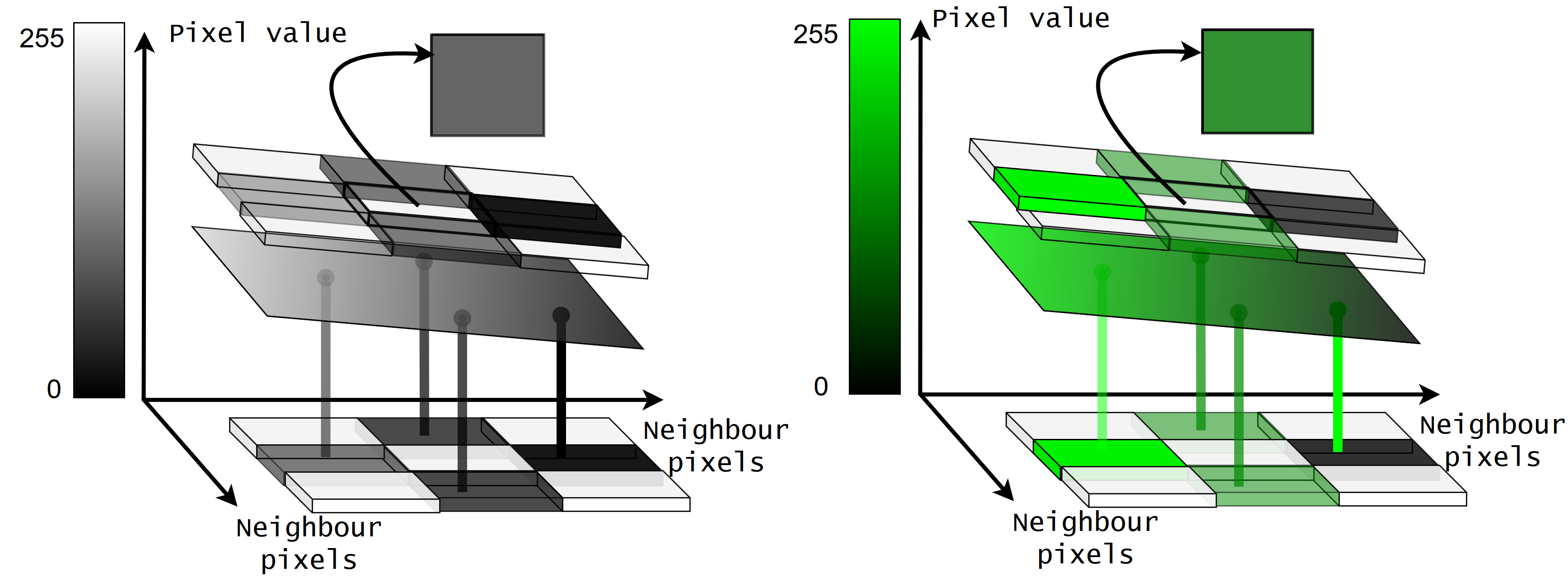 Below, Figure 2 illustrates how the behaviour of the pixel values in the RGB colourspace. The minimum RGB value of one channel is zero (0), which is visualised as black. The highest value 255, is white in a greyscale image, but in a colour channel, it is visualised as the most intensive red, green or blue tone. Intuitively the interpolation can be seen as a pixel value surface formed from the mean of neighbouring pixels. The pixel value surface is drawn above the original Bayer pattern in the illustration (Figure 2). After interpolation, the top pattern with the individual middle pixel represents the computed pixel value. The green and red examples are fading colours, so the surfaces are inclined. The blue represents an equally intensive pixel neighbourhood, where the pixel value surface is drawn horizontally straight.